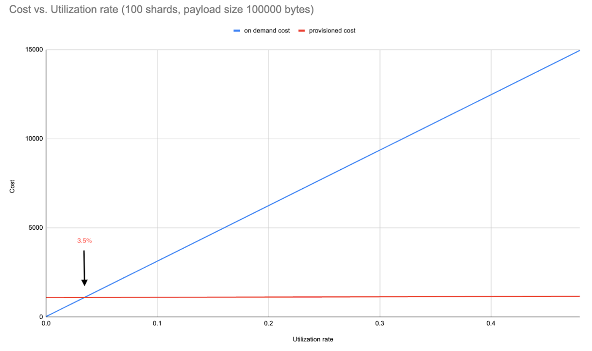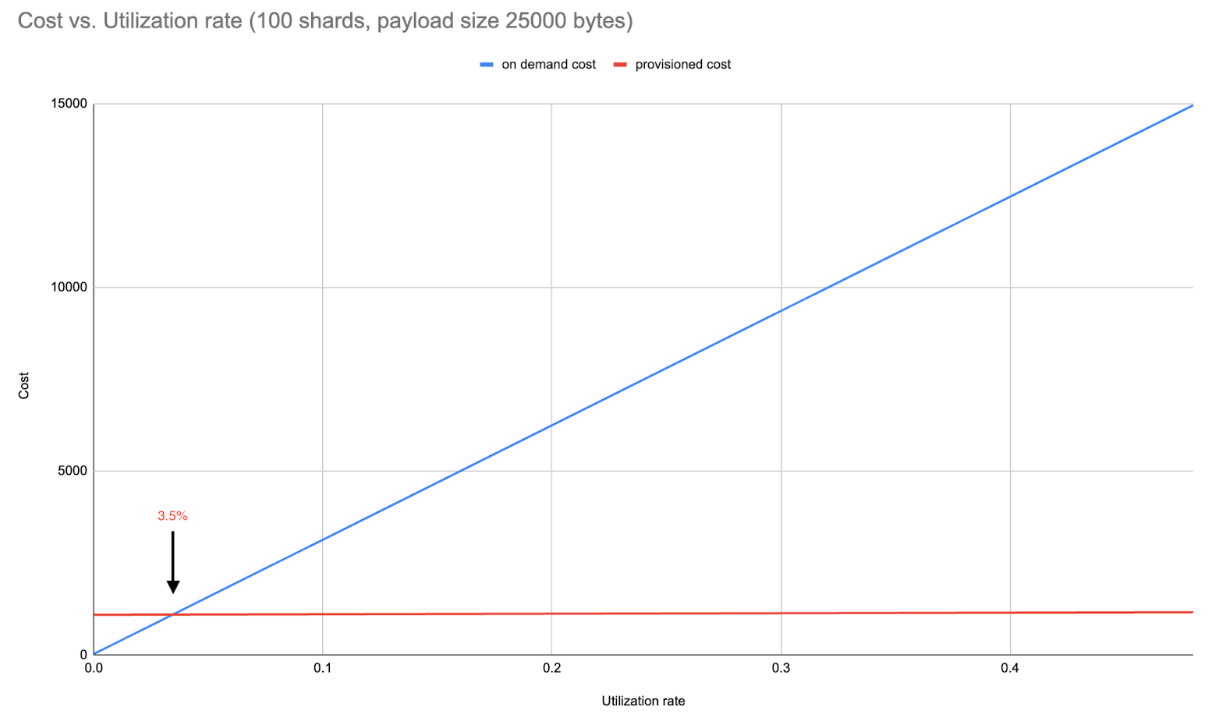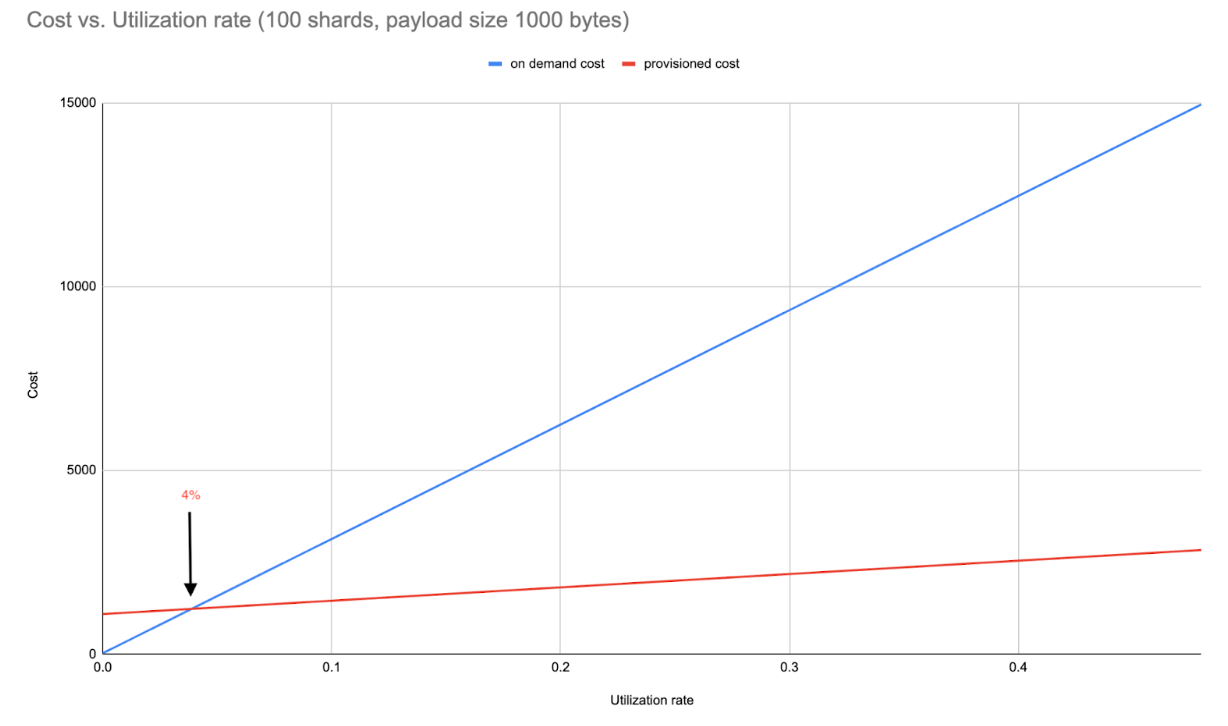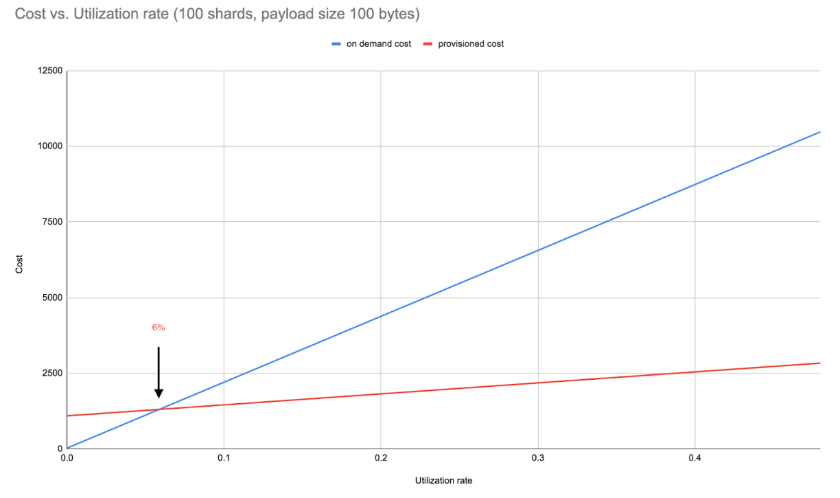 The cost shown in these graphs for provisioned mode is based on 100 shards and the per-record cost at the utilization rate on the x-axis. The cost for the on-demand mode is based on sending the equivalent data through an on-demand stream. Based on these graphs we can see that the cost starts favoring provisioned mode around when utilization is over 5%.