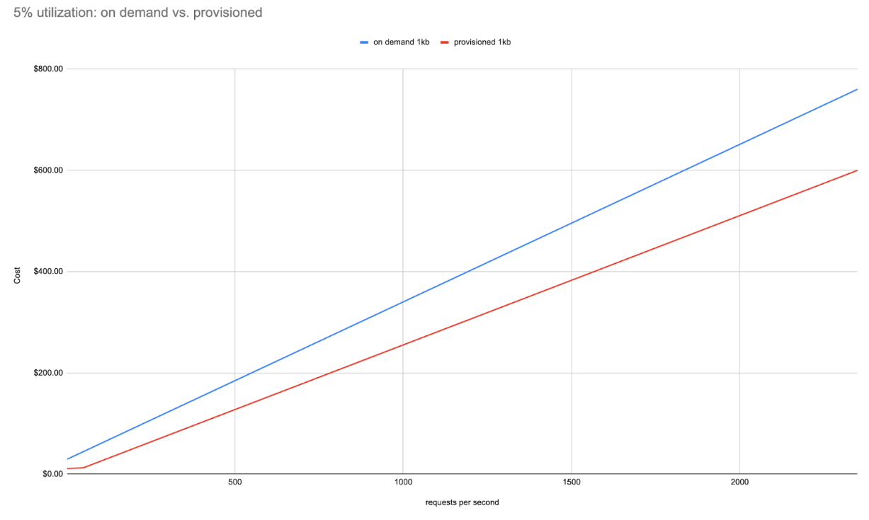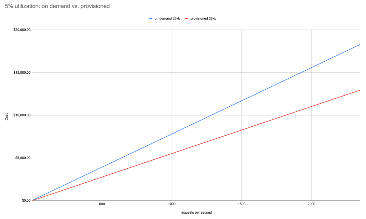 The four graphs from above show us that at 5% utilization, the provisioned mode is cheaper for all but the 100-byte payload size. Generally larger payload sizes favor provisioned mode because of the difference in rounding of the payload sizes: 1kb vs. 25kb respectively for on-demand and provisioned mode.