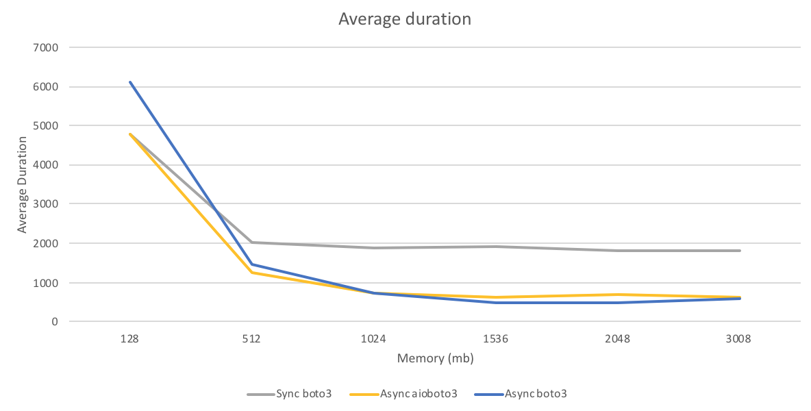 loop.run_until_complete(main())I ran each function in a Python 3.8.x Lambda Function. I also used different memory sizes to see how much that affected the execution time.