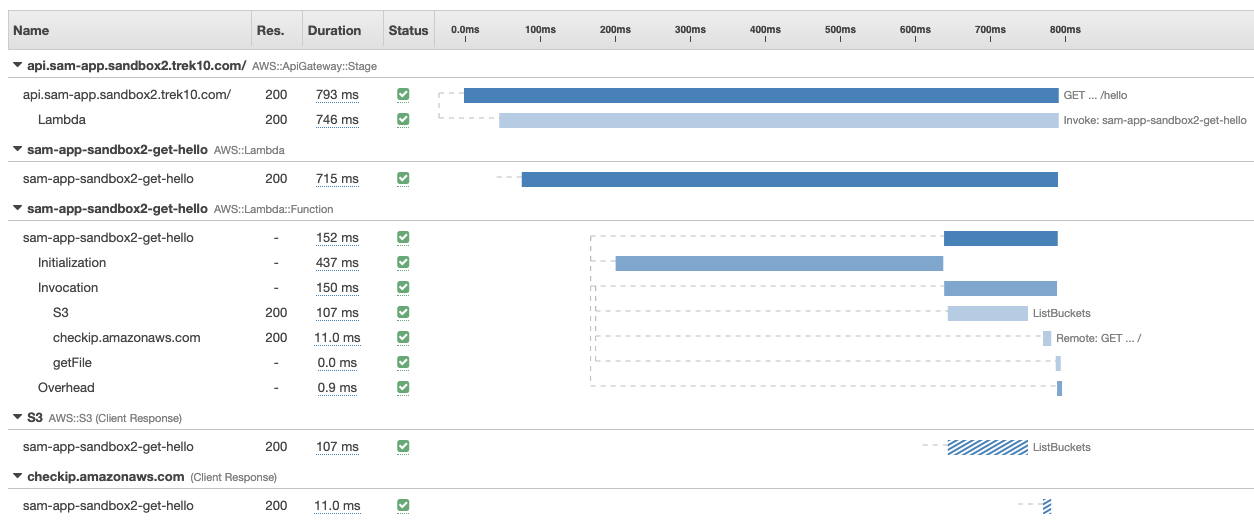 Now let’s say there’s a part of your code that’s doing a ton of processing, and you’d want to profile that too. That’s still possible, but it’s going to take a bit more work than the previous two methods of instrumentation. The X-Ray sdk provides a xray.captureAsyncFunc method that can be used to create subsegements for any piece of code or function (documented here). So if you wrap some piece of functionality using this method, no new segments will be added to your service map, but within the AWS::Lambda::Function segment, you’ll see the function call was instrumented in the trace timeline (in this case we wrapped a function and named the subsegment name “getFile”):