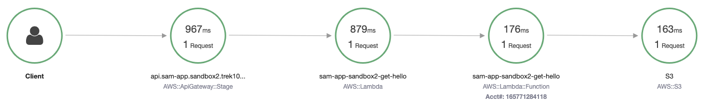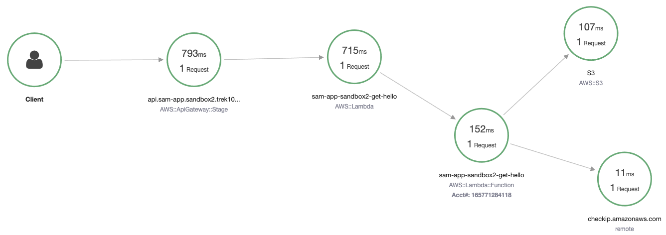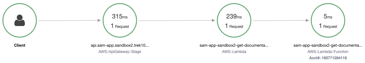 Tracing: PassThroughYou’ll see X-Ray traces within the AWS X-Ray console that contain Segments around API Gateway and the Lambda service itself. The segments contain information around how long the request took within that given component of your architecture, their status codes, and can even be used to determine things like cold start performance hits. The service map might look something like this:
