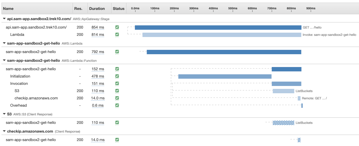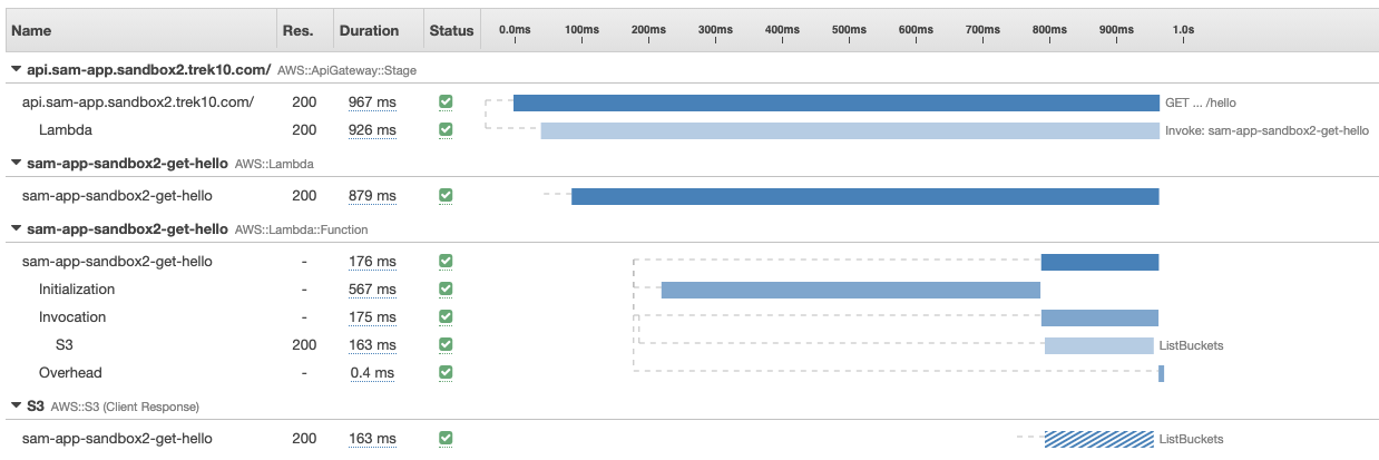 If your backend implementation is making network requests, that’s likely the largest source of latency in your API, so you’ll want to profile it, right? In a cloud native environment, X-Ray is the goto solution for that problem. Let’s say your Node JS code is making an AWS SDK request, for instance to get the number of buckets in a request: