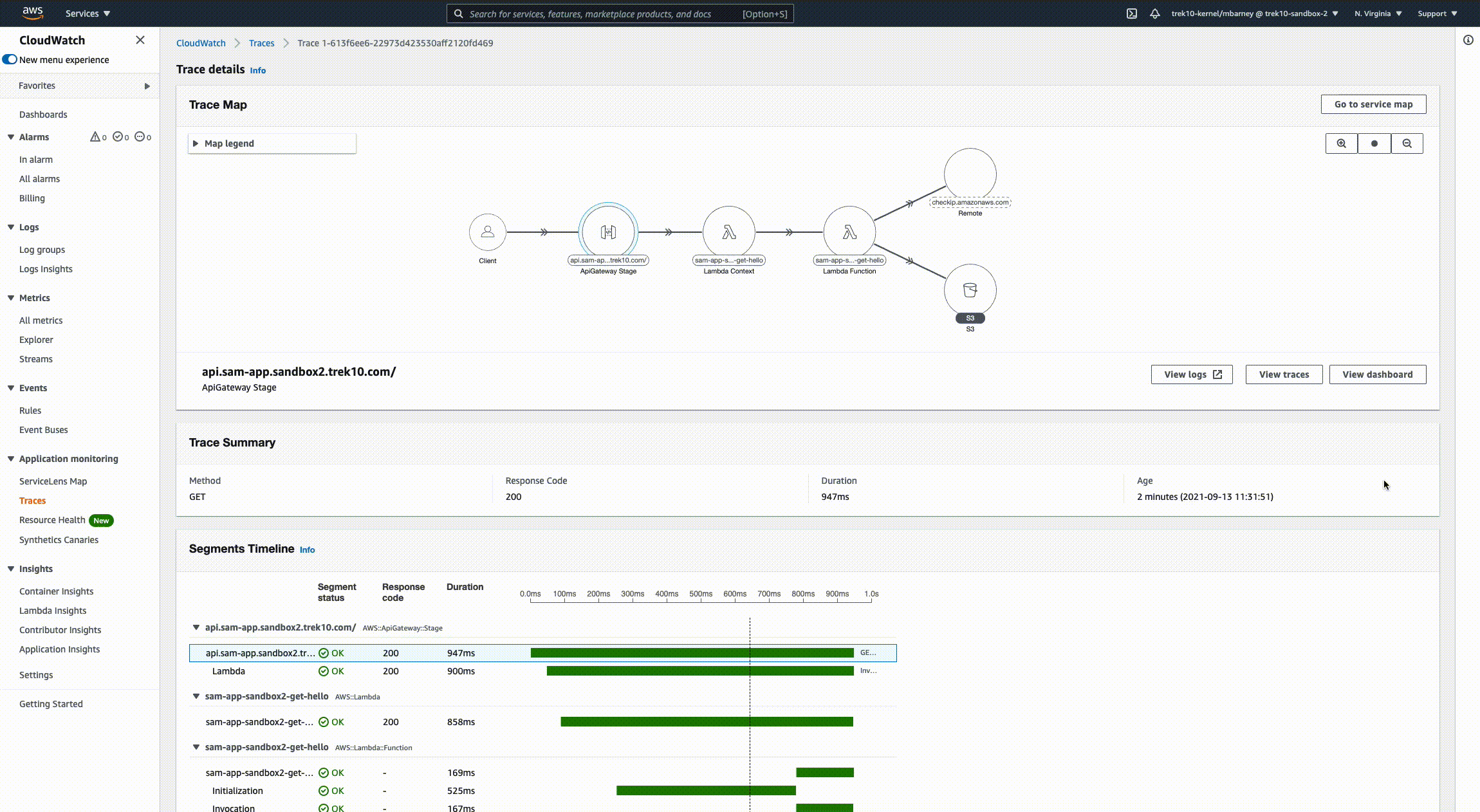 Data from each component and the request itself is collected and aggregated into a “Trace.” A Trace is identified in AWS X-Ray by a Trace ID, and contains metadata around the origin of the request - such as the URL of a request.