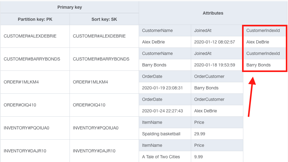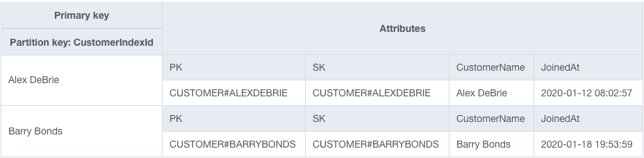 Instead of doing that, I'll add an attribute called CustomerIndexId on my Customer items. Now my table looks as follows: