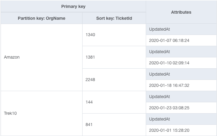 However, this design causes some problems. When updating an item in DynamoDB, you may not change any elements of the primary key. In this case, your primary key includes the UpdatedAt field, which changes whenever you update a ticket. Thus, anytime you update a ticket item, we would need first to delete the existing ticket item, then create a new ticket item with the updated primary key.