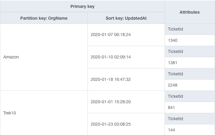 In this table design, the organization name is the partition key, which gives us the 'group by' functionality. Then the timestamp for when the ticket was last updated is the sort key, which gives us 'order by' functionality. With this design, we could use DynamoDB's Query API to fetch the most recent tickets for an organization.