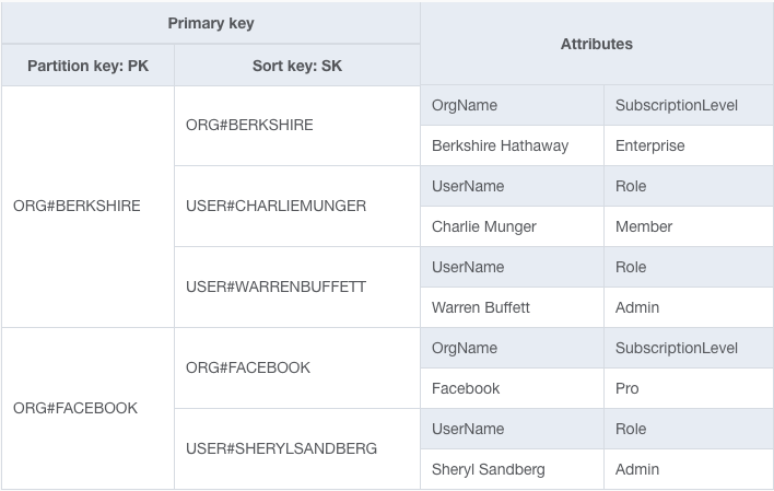 For example, imagine we have an application that includes both Organizations and Users. A User belongs to a particular Organization. We might have our PK and SK values modeled as follows: