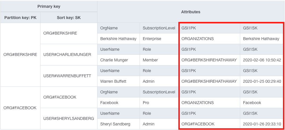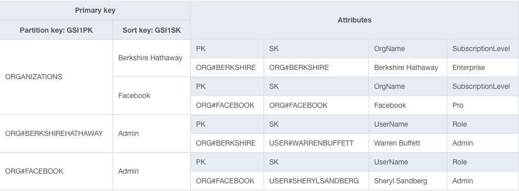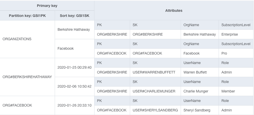 The top item collection includes all Organizations, and the next two include the Users for Berkshire Hathaway and Facebook, respectively. By overloading our secondary index key schema, we have satisfied two access patterns in a single index.