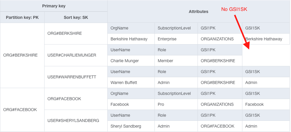 We'll keep the same GSI1PK and GSI1SK pattern for Organizations. For Users, we'll still use ORG#<OrgName> as the GSI1PK, but we'll only have a value in GSI1SK if the user is an Administrator.