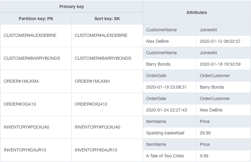 Notice how both types of entities are in the same table and use different patterns for the PK and SK to co-exist. By using generic primary key attributes and storing different values there for different types of entities, we're overloading our primary key. The attributes mean different things for different entity types.