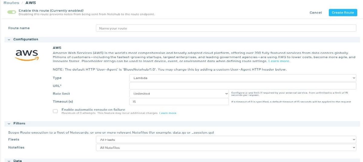 Notehub offers several ways to integrate with AWS, however, in a limited capacity. Incoming messages can be backed up to an S3 bucket at a set time or volume interval with the purchase of the developer edition of Notehub.