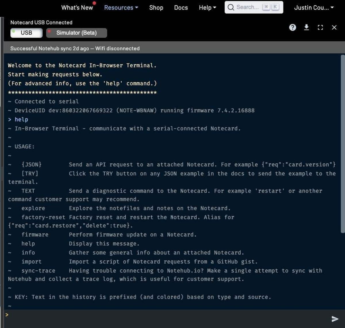 The notecard has an external micro-usb serial interface that can be used to issue commands directly using the notecard-cli or the online interface