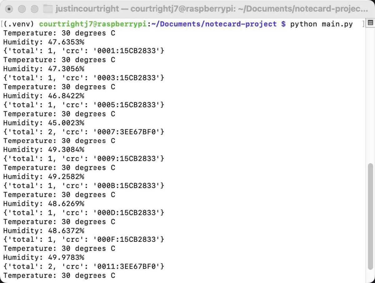 After the device is provisioned, run the following Python script on the Raspberry Pi after installing the required notecard pip packages: