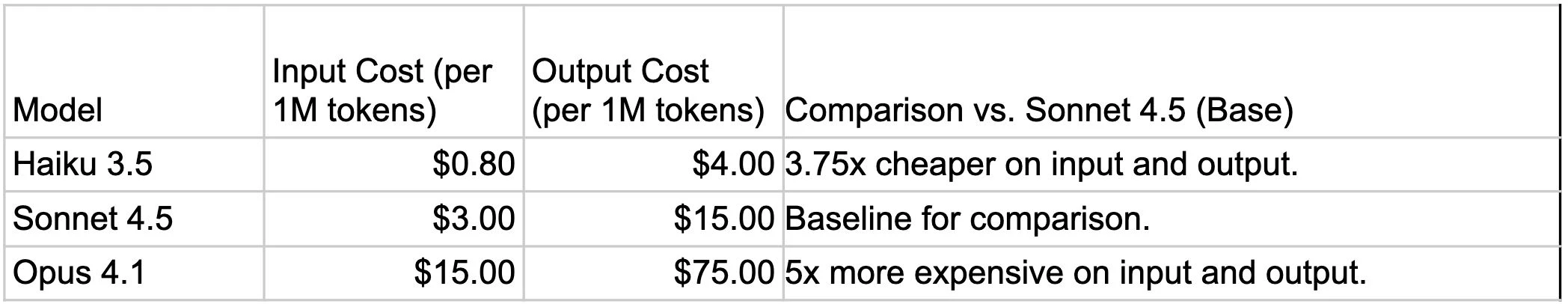 Compare this to other models in the Claude family. Haiku 3.5 runs at $0.80/$4 (input/output), making it 3.75x cheaper on input and output than Sonnet 4.5. Opus 4.1 costs $15/$75, 5x more expensive than Sonnet 4.5 on both input and output. The performance doesn't scale linearly with cost, so you need to think about the task requirements. In most cases, Sonnet 4.5 serves as a strong default choice, with other models reserved for specialized use cases.