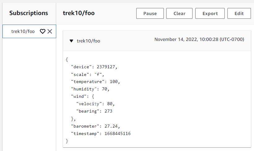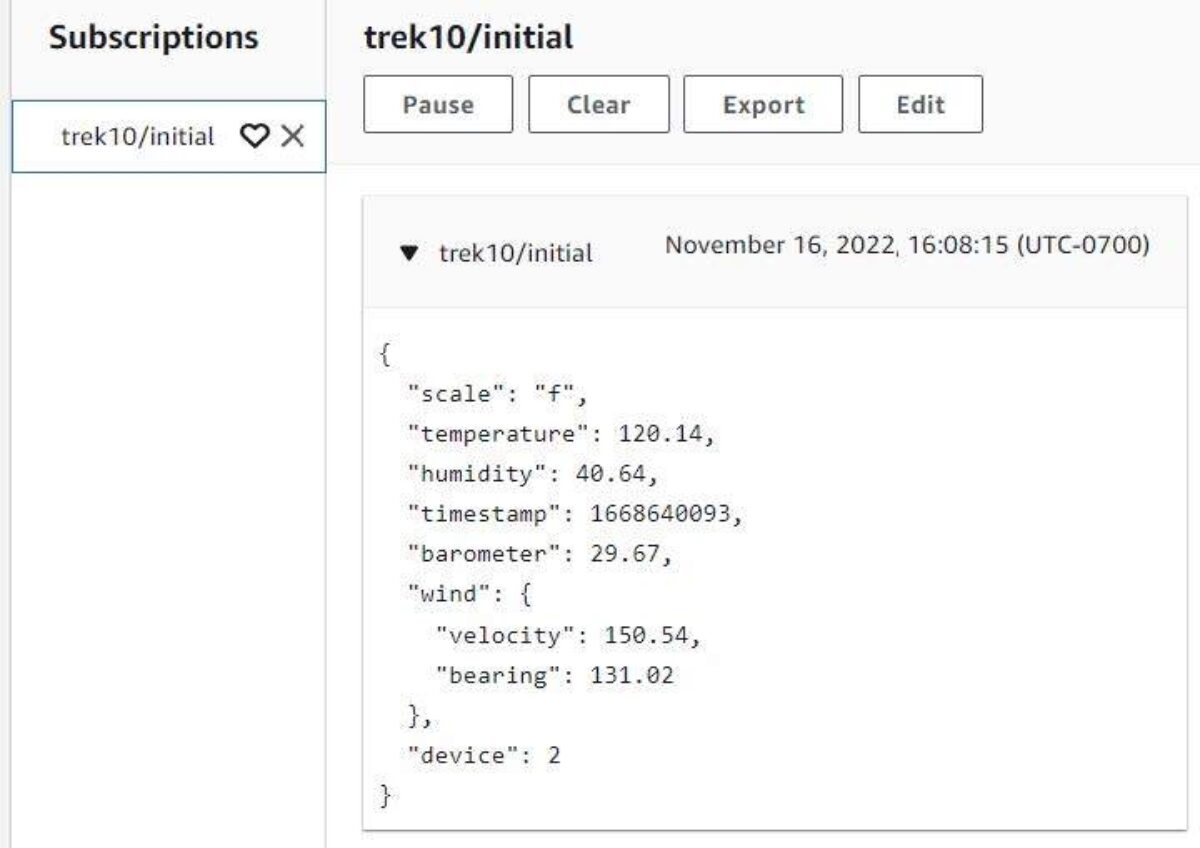 Published message: {"scale": "f", "temperature": 120.14, "humidity": 40.64, "timestamp": 1668640093, "barometer": 29.67, "wind": {"velocity": 150.54, "bearing": 131.02}, "device": 2}Jump over to the AWS web console and see if your transmitted messages were received by the “trek10/initial” topic.