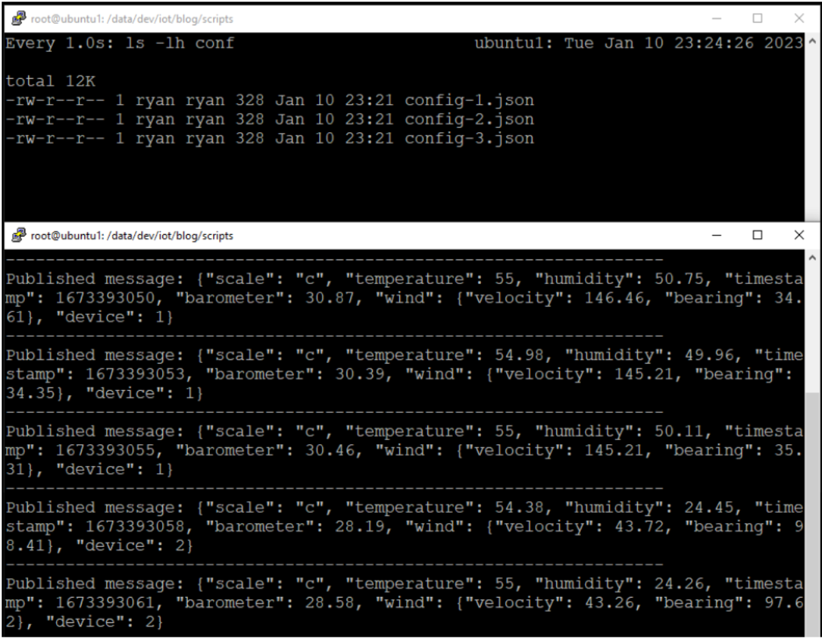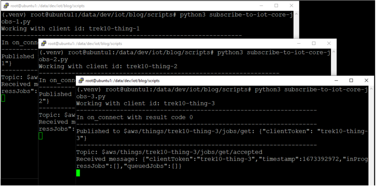 doneOnce the job has been created, you should see something like the following in each of the simulated device’s output: