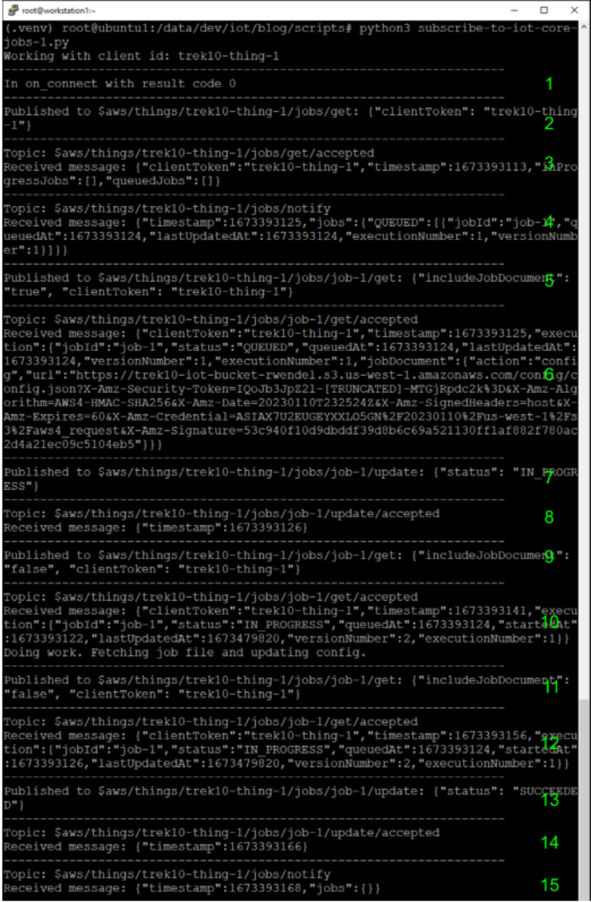 To be more specific, a thing will typically interact with the following topics when working through an IoT Job: