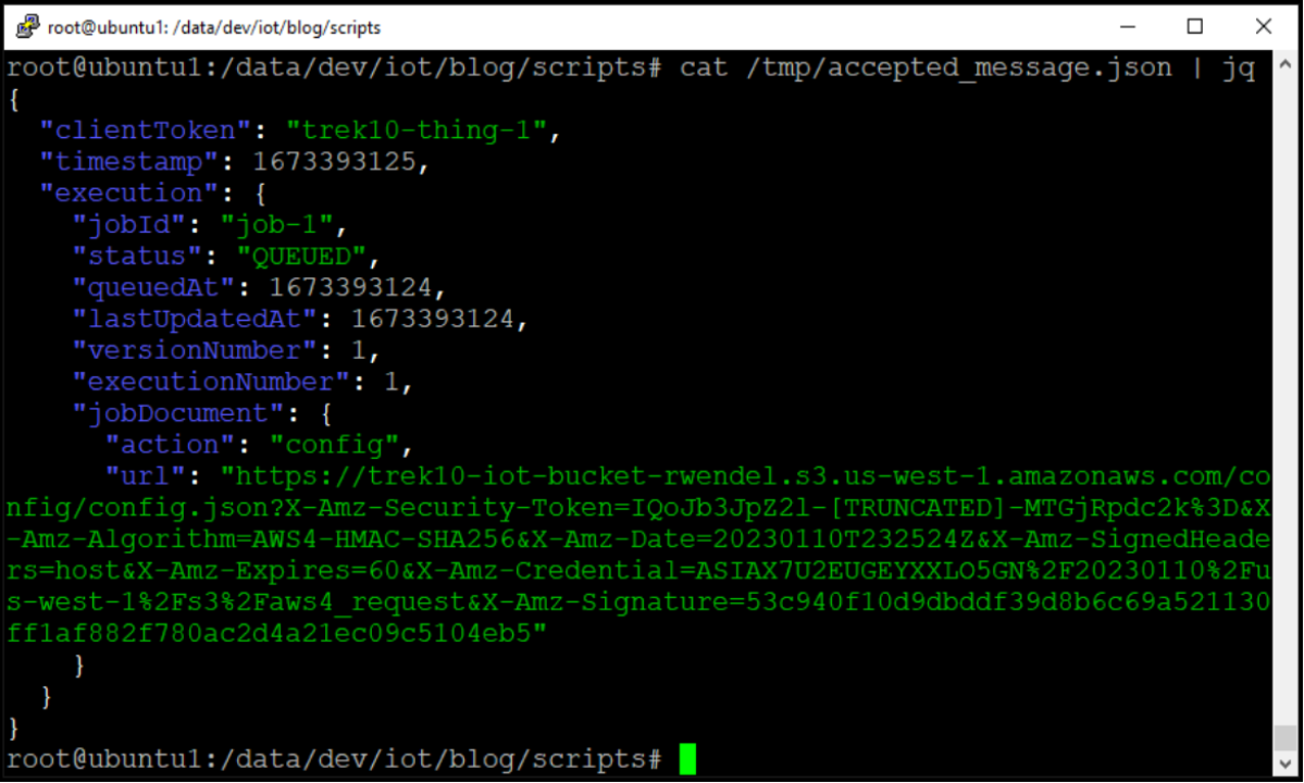Note that IoT Jobs translated our S3 pre-signed URL placeholder in the job document to a functional URL. This is what allowed our device to authenticate to S3 and download the new configuration file.