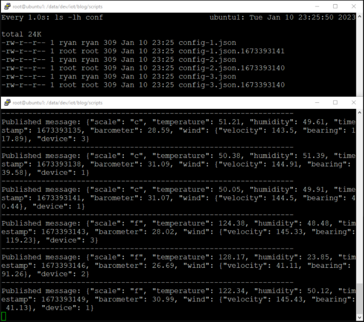 watch -n 1 "ls -lh conf"Execute the following command to run the updated version of the publish script in a loop every second: