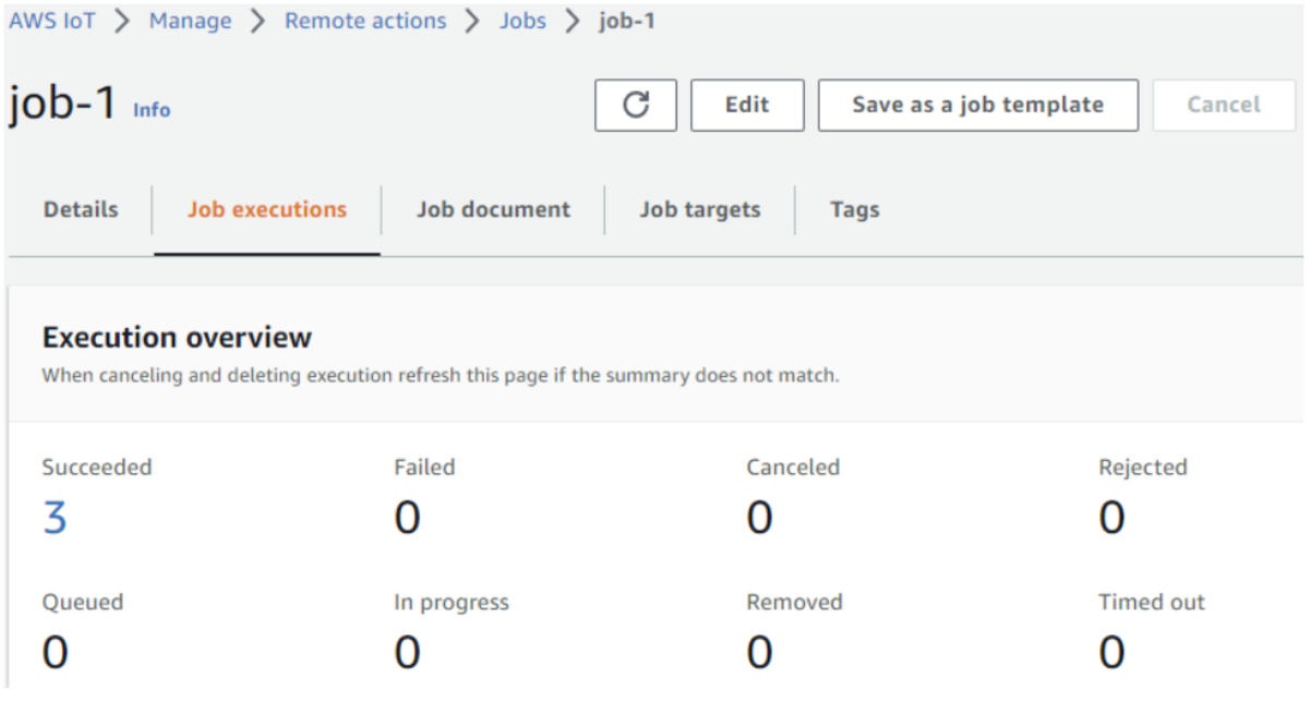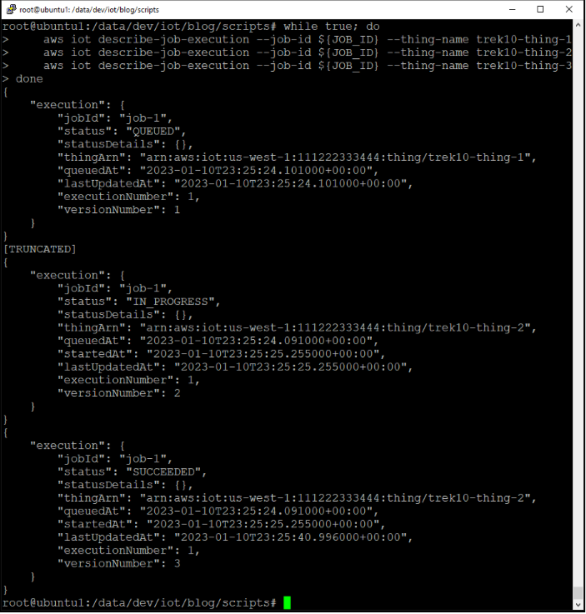 And finally, we look over the job execution details and notice that each device's status transitioned from QUEUED to IN_PROGRESS and then finally to “SUCCEEDED”.