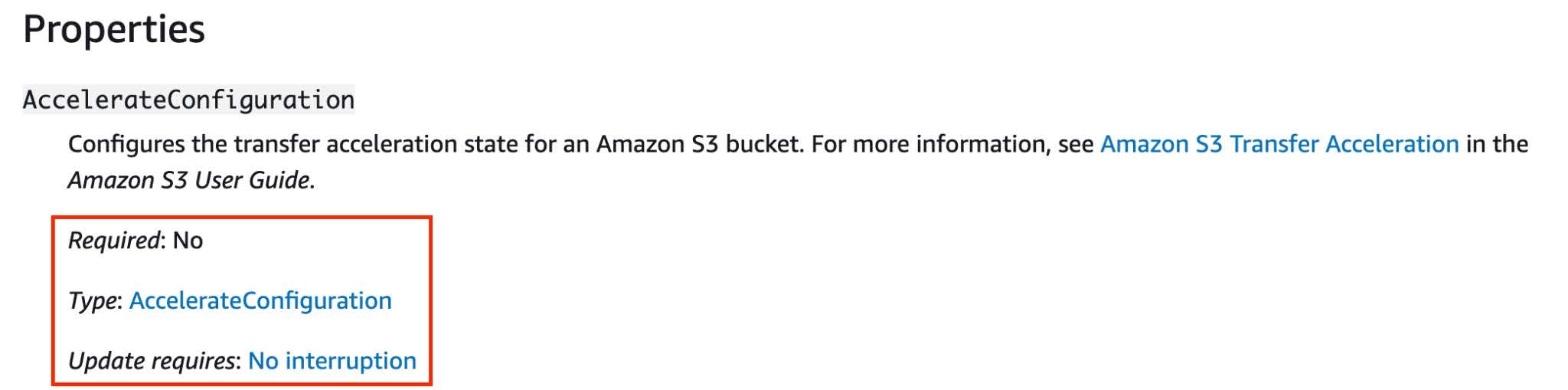 When delving into a new resource you haven’t yet built in CloudFormation, the AWS CloudFormation docs can be a beast to deal with. Something that has helped me get up and running with new resources quickly is paying attention to the property info, provided in the description of each property under the “Properties” section of the AWS docs.