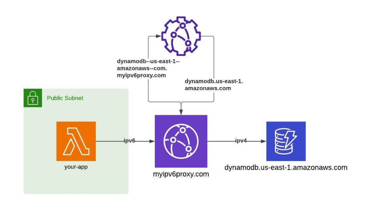 Amazon CloudFront, while typically meant to be a CDN for cached assets, can also be used as a generic HTTP proxy. You can use a custom origin to route requests to any HTTP endpoint, and CloudFront will handle the request and response. CloudFront distributions can be called over IPv6, and they can make requests to your origin over IPv4. So you can create a CloudFront distribution, use the regional DynamoDB endpoint as the origin, and have your workload call the CloudFront distribution over IPv6. This is a pretty simple pattern, but there are some caveats you should know about.