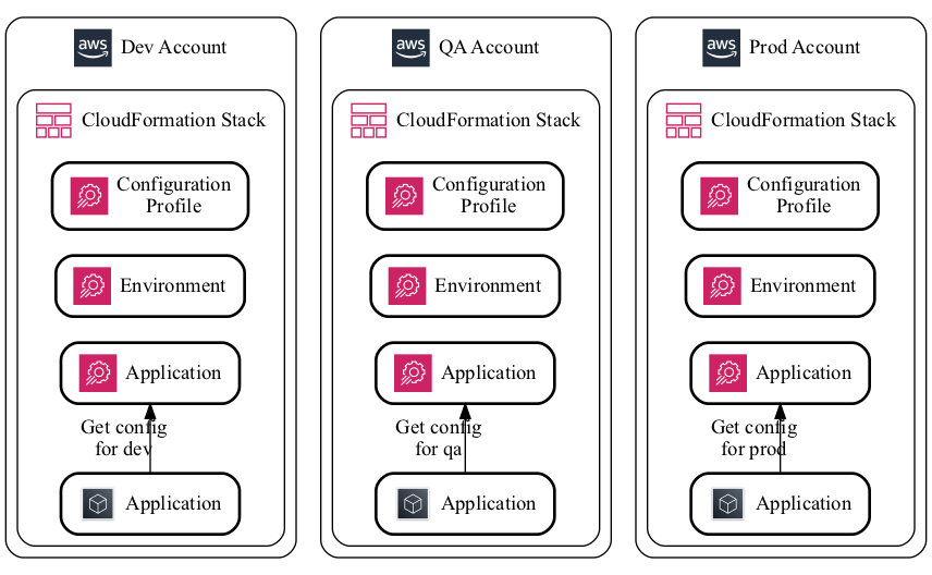 AWS CloudFormation supports AWS AppConfig, so you'll want to define your AWS AppConfig Applications, Environments, and ConfigurationProfiles via Infrastructure as Code (IaC), usually logically organized with the application that's consuming it. Because your CloudFormation templates get deployed to each environment, this makes the concept of using AWS AppConfig Environments strange. If you were to use them, you'd have an AWS AppConfig Application defined separately from the rest of your infrastructure, and then define the AWS AppConfig Environment with your application. However, this makes it tricky when you're deploying your application environments to different accounts (AWS AppConfig does not support cross-account access).