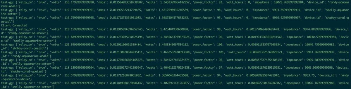 Lastly, we test our entire deployment by running our Trek10 Device Simulator tool (a specialized tool we use at Trek10 to deliver and test end-to-end IoT systems for clients) to publish data to the Greengrass Core MQTT endpoint, though you could replicate this by using an open source library such as the AWS IoT Greengrass PubSub SDK for Python.