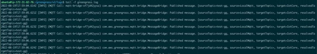 We can also check the logs on the Greengrass instance by referencing the /greengrass/v2/logs/greengrass.log file to verify that messages are being routed through the core device to AWS: