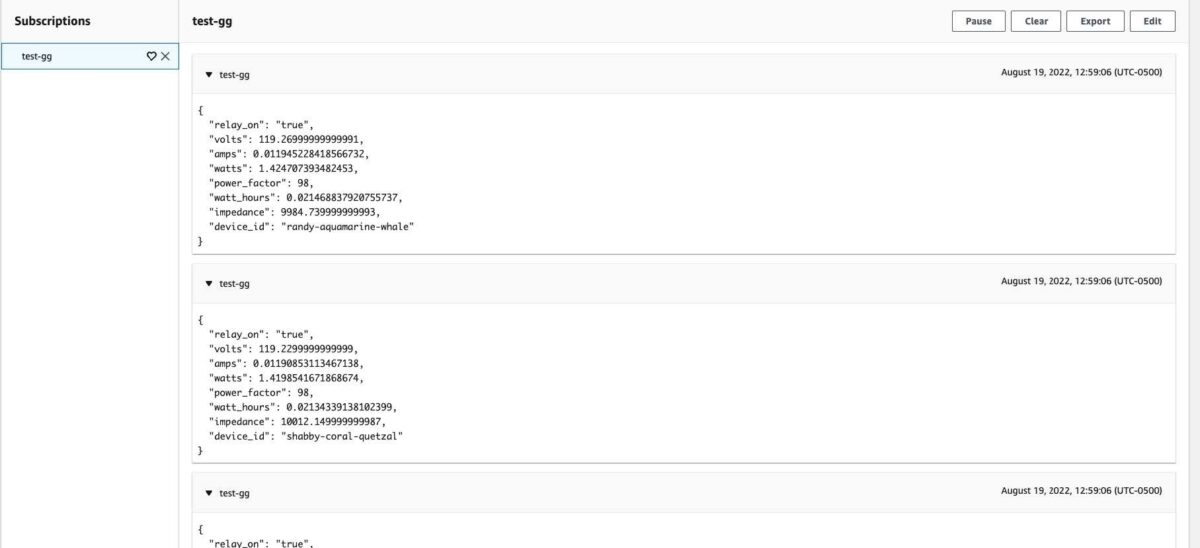 Finally, we can navigate through the console to the AWS IoT Core’s MQTT test client to ensure that the messages make it to AWS: